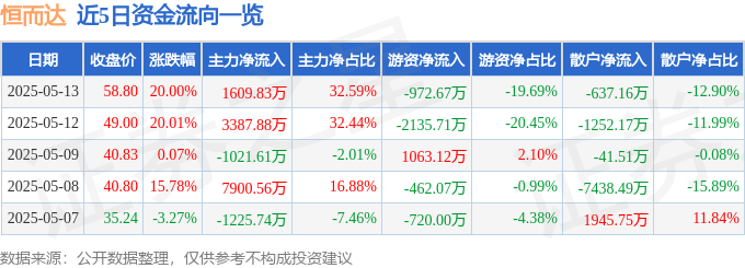 5月13日的资金流向数据方面,主力资金净流入1609.83万元,占总成交额32.59%,游资资金净流出972.67万元,占总成交额19.69%,散户资金净流出637.16万元,占总成交额12.9%。